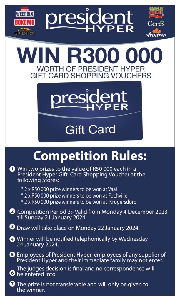 Competition Rules: Win two prizes to the value of R50 000 each in a President Hyper Gift Card Shopping Voucher at the following Stores: Liqui FRUIT Ceres fruitree